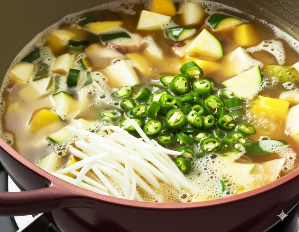 마지막으로 다진 마늘 1/2 작은술과 매콤한 맛을 원한다면 송송 썬 청양고추를 넣고 1~2분 정도 더 끓여줍니다. 이때 국물을 맛보고 싱겁다면 된장을 약간 더 풀거나 국간장 아주 소량을 넣어 간을 맞춰주세요. 칼칼한 맛을 원한다면 고춧가루를 약간 넣어도 좋습니다.